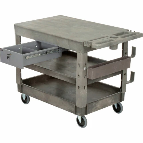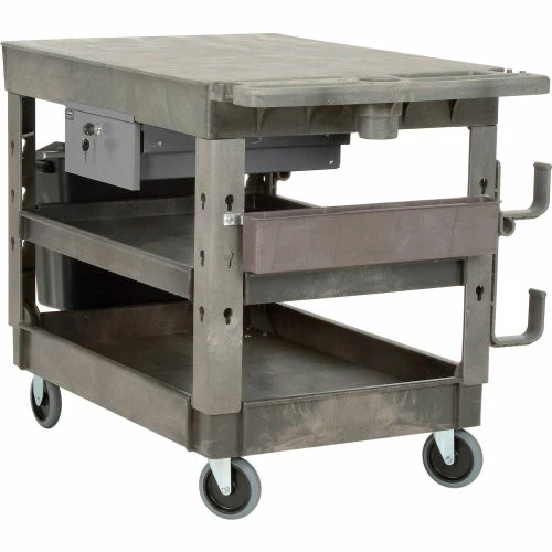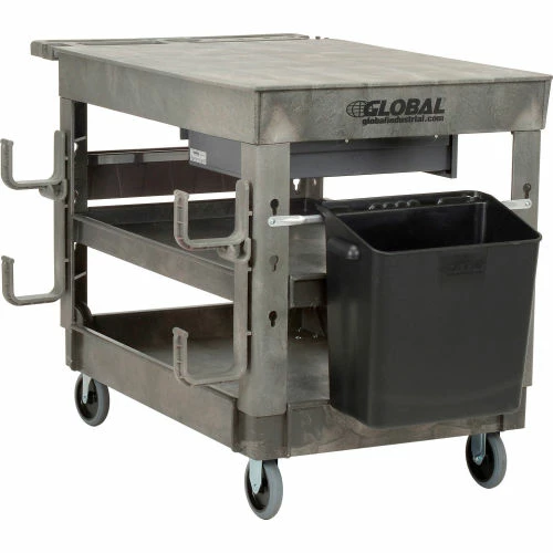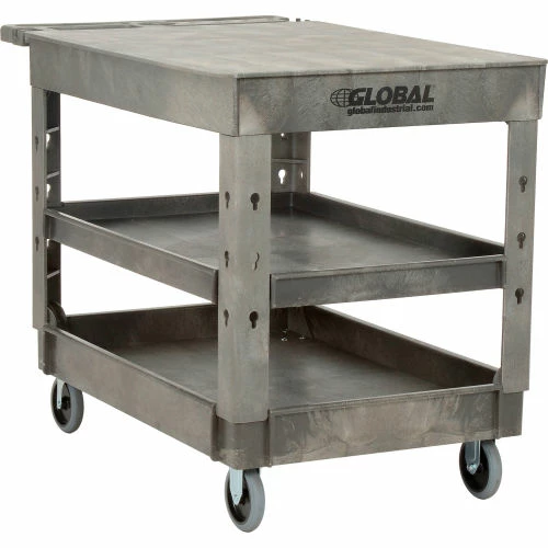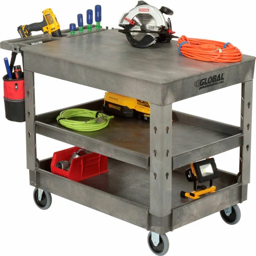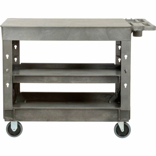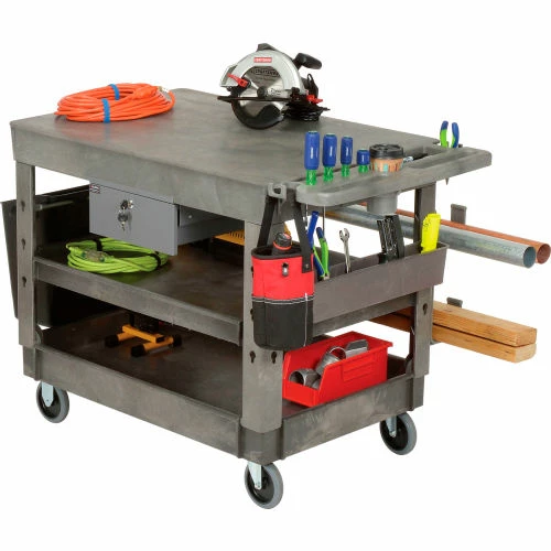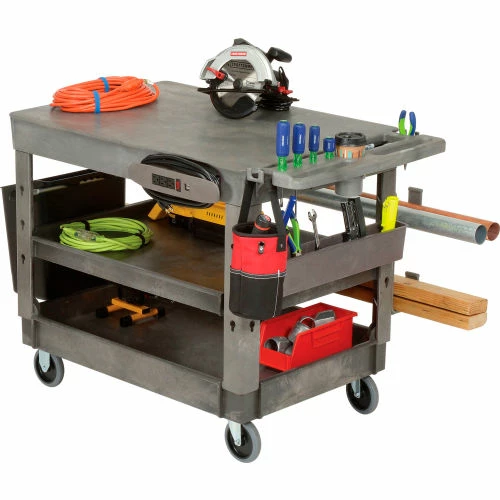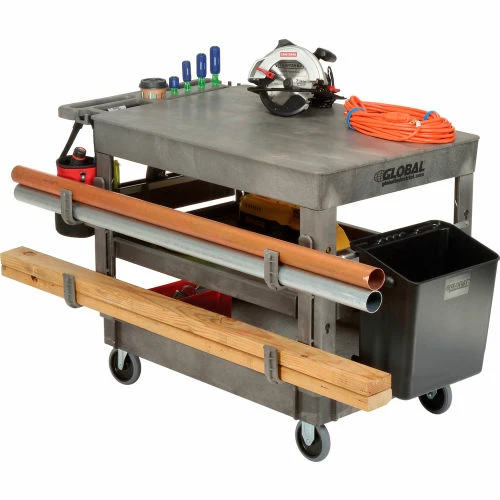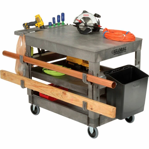 Support legs offer 4″ spaced slots on each side of the legs to hold specialized accessories to increase your productivity. Choose from hooks, spool holders or utility bins, ladder holders and power strips all designed to improve the functionality of these carts, sold separately. 500 lb. capacity; 250 lb. per shelf evenly distributed not to exceed overall capacity. Easy assembly.