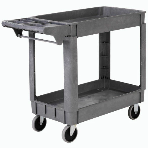 Heavy duty, tough structural foam plastic construction resists scratches, dents and cleans easily. 3″ deep trays help to retain cargo during transit. Lightweight, quiet rolling cart maneuvers easily on 2 swivel, 2 rigid 5″ rubber casters. Assembles easily. Personalize your plastic utility service cart with our great accessories. 1 Year Limited Warranty.
