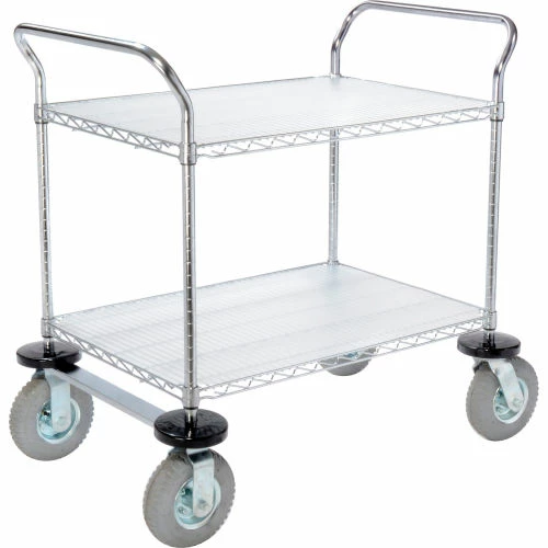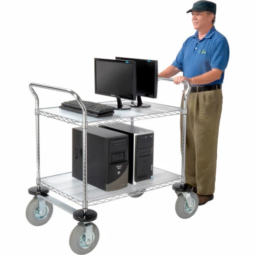 Securely transport and store valuable, sensitive equipment. Ideal for bulky items, too. Nickel chrome plated wire is attractive and rust resistant. Non-conductive 0.035″ clear polyethylene shelf liners included. Shelves are adjustable on 1″ increments. Shock absorbing 8″ pneumatic wheels (2 swivel, 2 rigid) are smooth rolling and highly maneuverable. Donut bumpers help protect the walls. 44″ overall height. Assembles easily. 1 Year Limited Warranty when used in a dry storage application.