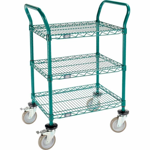 - Includes 3 shelves, 2 U handles, and 4 polyurethane swivel casters, 2 with brakes