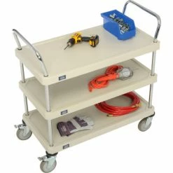 Nexel® Plastic Utility Cart w/3 Shelves & Poly Casters, 900 lb. Cap, 36"L x 18"W x 39"H, Tan